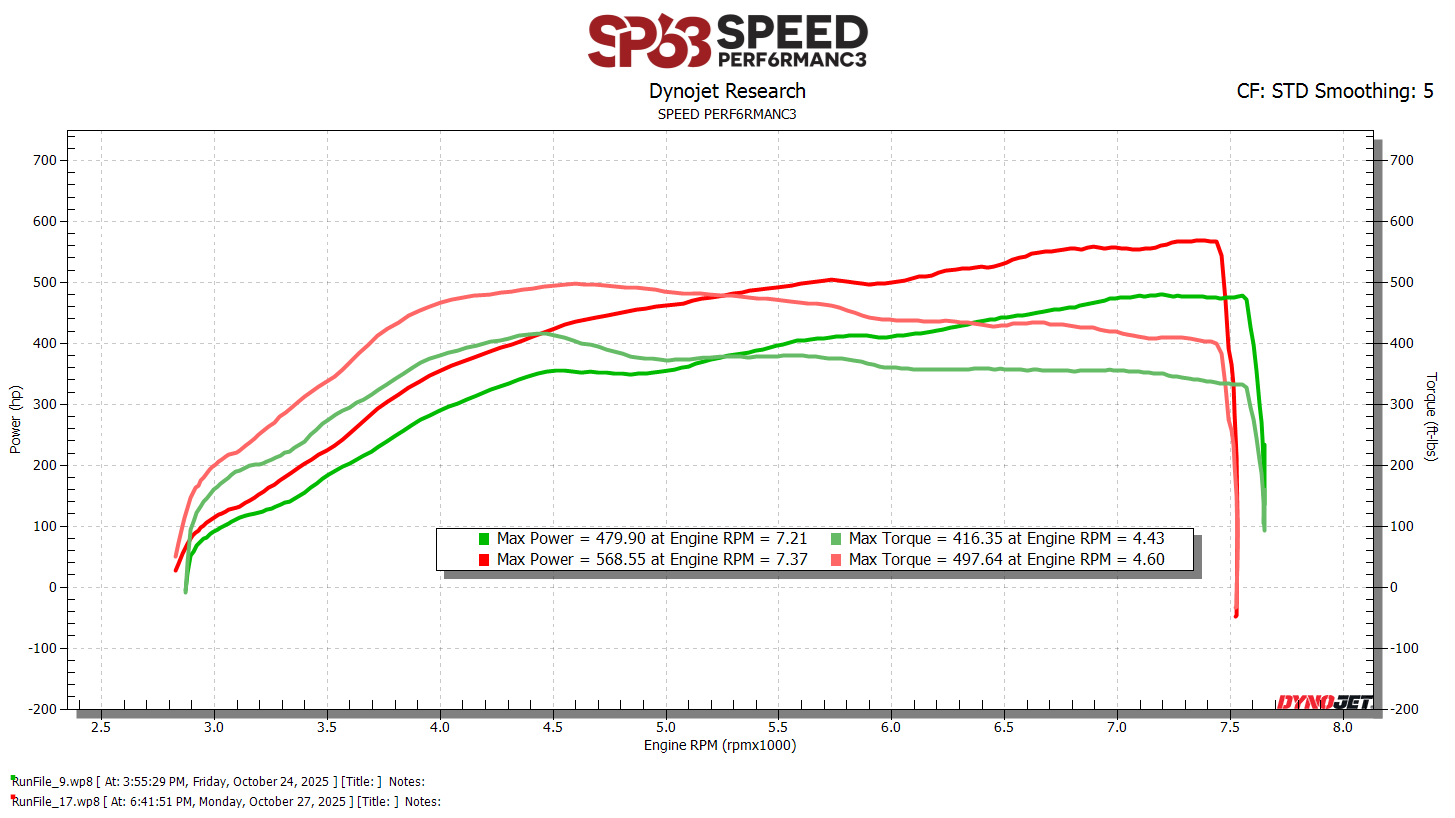The Race injectors have been designed and tested to flow 45% more fuel than the stock 2.3 injectors, unlocking significant increases in horsepower, with proper tuning. We have seen real world results of 480 whp on 93 octane and 570 whp on E60 on the SpeedPerf6rmanc3 Dyno!